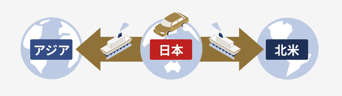 イラストイメージ:日本から北米、アジア、ヨーロッパへ車が届けられている