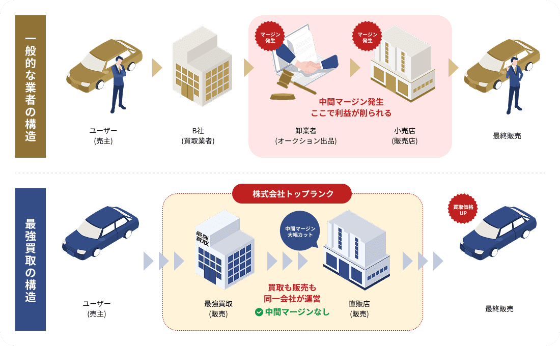 買取と販売の間にオークションなどの業者が入れば、当然その利益(中間マージン)が買取価格から差し引かれます。一方で最強買取が買い取った車は、車種や状態にもよりますが、自社であるトップランクが運営する直営店舗で販売するケースもあります。そのため業者間の転売や卸売を挟まず、中間マージンがかかりません。